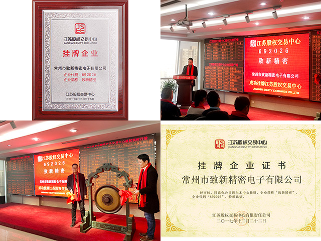 2018年1月11日下午,江蘇股權(quán)交易中心企業(yè)集中掛牌儀式隆重舉行。本次掛牌的共有38家企業(yè),其中常州市致新精密電子有限公司(以下簡(jiǎn)稱(chēng)“致新精密”)成功掛牌成長(zhǎng)板。掛牌儀式的成功舉行,要感謝江蘇股權(quán)交易中心對(duì)我司各方面實(shí)力的審計(jì)與認(rèn)可。